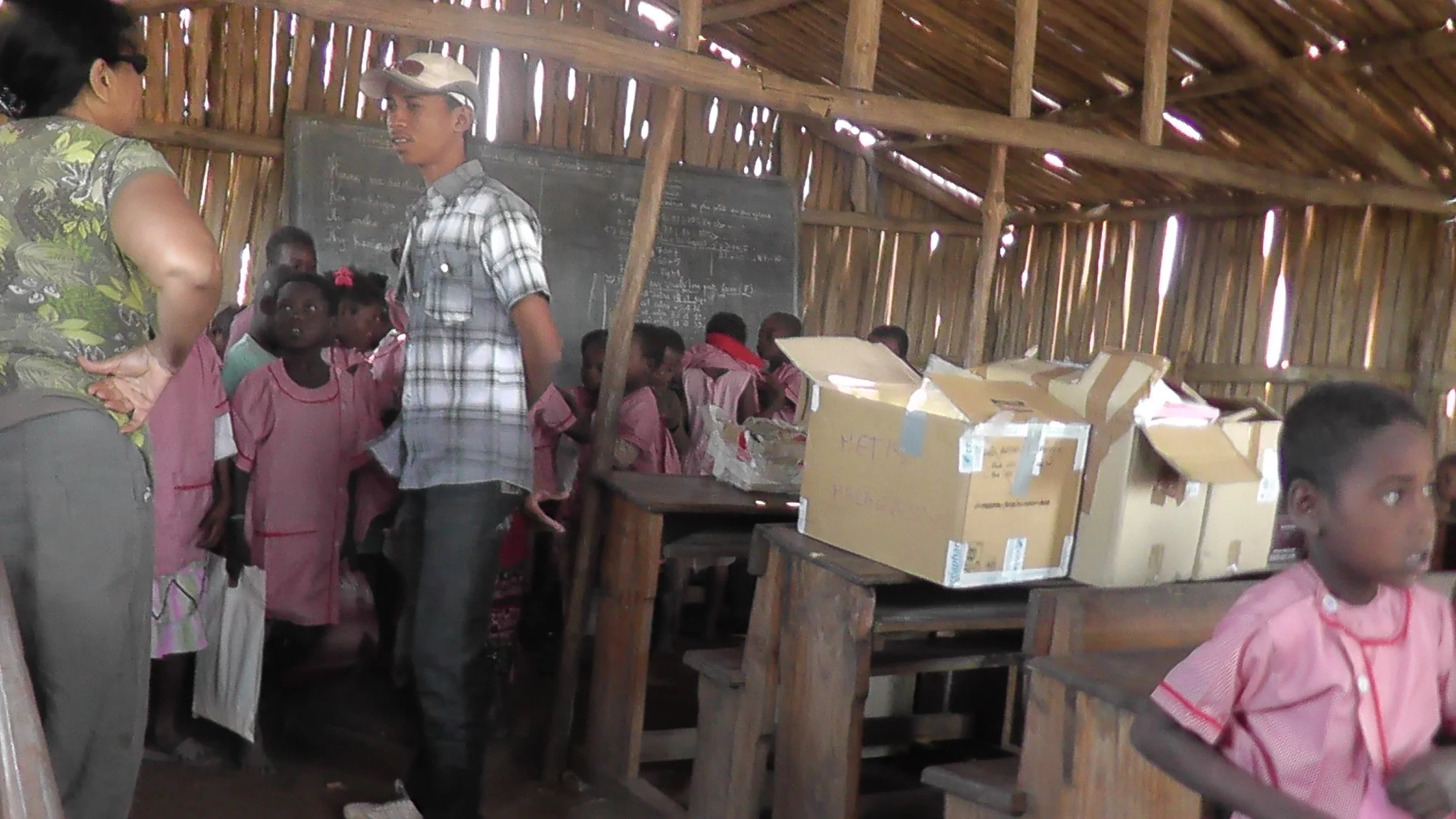 Distribution de cahiers, crayons, craies, jeux éducatifs et autres fournitures scolaires issus de dons de particuliers et d’écoles.